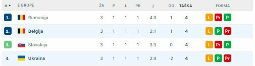 E grupėje po 3 sužaistų rungtynių visos keturios rinktinės surinko po 4 taškus. Rumunija finišavo pirmoje vietoje, Belgija liko antra, Slovakija – trečia, Ukraina – ketvirta.